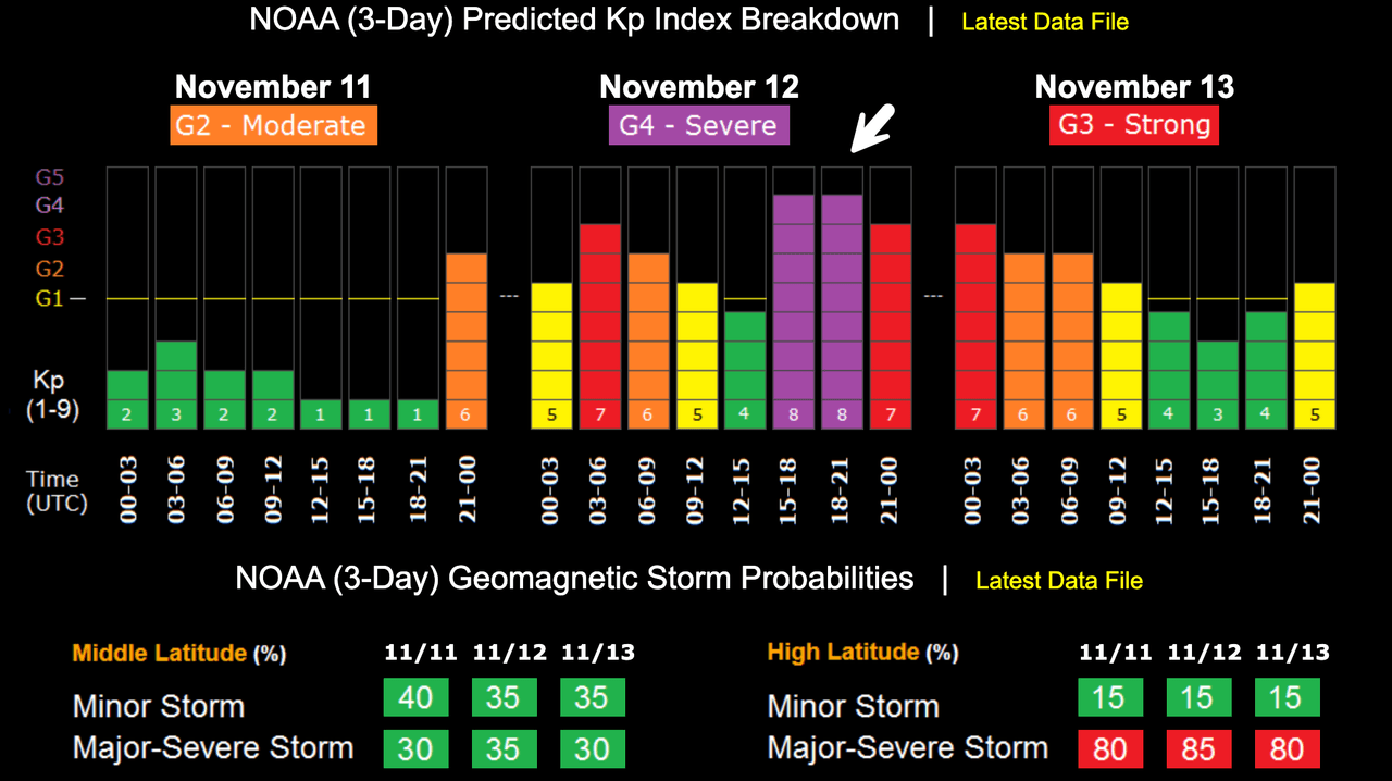 The website that tracks solar flares continued, "There is a chance that the three CMEs will merge into a single 'Cannibal CME,' a potent type of storm cloud that could cause a severe G4-class geomagnetic storm when it arrives on Nov. 12."