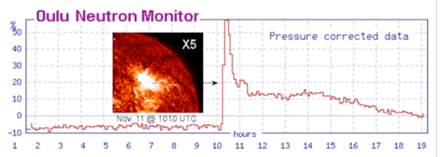 A 'GROUND LEVEL EVENT' IS UNDERWAY: Today's X5-class solar flare from sunspot 4274 hurled a fuisillade of energetic protons toward Earth. Some of the particles are so powerful, they are penetrating the atmosphere all the way to the ground. "This is a very significant event," says Professor Clive Dyer of the Surrey Space Centre. "Neutron monitors around the world are detecting it."